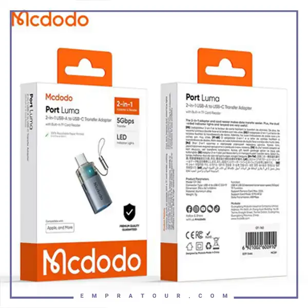 تبدیل OTG و رم ریدر تایپ سی مک دودو Mcdodo OTG 2in1 OT-7600 یک ابزار هوشمند، سریع و قابل اعتماد است که نیازهای روزمره شما در زمینه انتقال داده و افزایش حافظه را به بهترین شکل ممکن برآورده میکند. با طراحی جمعوجور، بدنه آلومینیومی مقاوم، سرعت بالای انتقال دادهها و قابلیت پشتیبانی از کارت TF تا ۵۱۲ گیگابایت، این محصول یک همراه عالی برای گوشی، تبلت و لپتاپ شما خواهد بود.