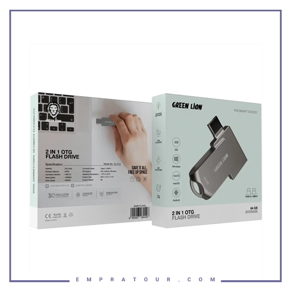 فلش OTG دوکاره Green Lion 2 in 1 OTG GN2N1FL256SL یک ابزار کاربردی و همه‌کاره برای کاربران مدرن است که نیاز به انتقال سریع، ذخیره‌سازی حجم بالا و سازگاری گسترده دارند. ظرفیت ۲۵۶ گیگابایت، رابط‌های تایپ سی و USB نوع A، طراحی چرخشی و قابلیت Plug & Play باعث می‌شوند این فلش تجربه‌ای راحت و مطمئن از مدیریت داده‌ها ارائه دهد.این فلش برای تمامی افرادی که می‌خواهند فایل‌های خود را به سرعت و بدون محدودیت بین دستگاه‌های مختلف جابجا کنند، یک گزینه ایده‌آل و مطمئن است. چه در محیط کار، چه در خانه و چه در سفر، GN2N1FL256SL همیشه آماده پاسخگویی به نیازهای دیجیتال شماست و تجربه‌ای آسان و کاربردی از مدیریت داده‌ها فراهم می‌کند.