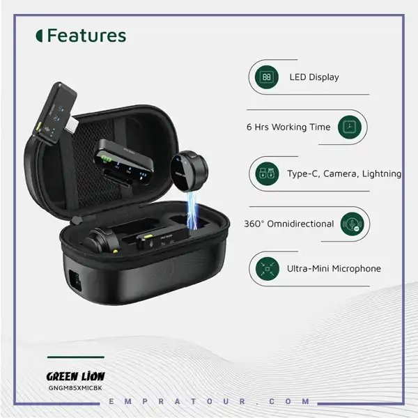 میکروفون بیسیم گرین لاین Green Lion GM-85X Microphone GNGM85XMICBK یک محصول حرفهای ، کاربردی و با کیفیت بالا برای ضبط و انتقال صدا است. با پوشش صدای ۳۶۰ درجه ، حساسیت بالا ، سازگاری گسترده ، برد طولانی ، تاخیر کم ، باتری با شارژدهی طولانی ، کیف چرمی و گیره مغناطیسی ، این میکروفون تجربهای حرفهای از ضبط ، انتقال و پخش صدا فراهم میکند.