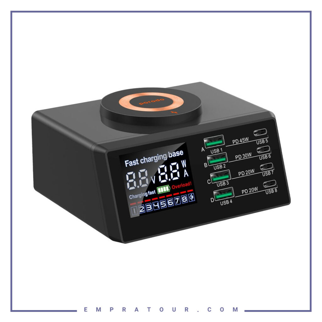 این هاب مجهز به یک صفحه نمایش دیجیتالی بسیار پیشرفته است که وضعیت شارژ دستگاه‌ها را به صورت دقیق نمایش می‌دهد. این نمایشگر به شما کمک می‌کند تا به‌راحتی از میزان شارژ و وضعیت هر دستگاه مطلع شوید.
