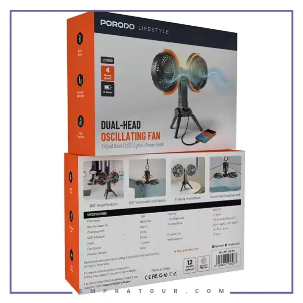 پنکه شارژی رو میزی به همراه پاور بانک پرودو Porodo Dual-Head Oscillating Fan PD-LFST150