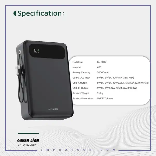 Green Lion Toledo 22.5W 20000mAh Power Bank GL-PX37 GNTOPB20KBK
