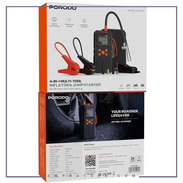 Porodo 4-In-1 Multi-Tool Inflator & Jump Starter with 150PSI Auto-Stop & SOS Lighting PD15KJSPBK