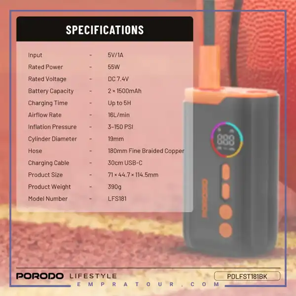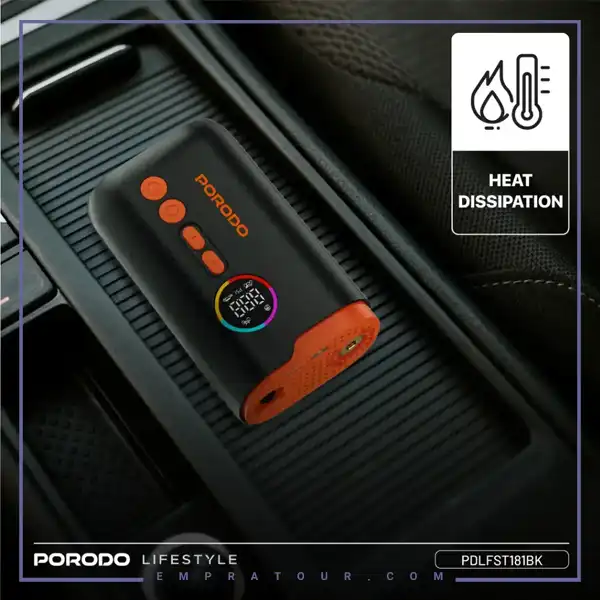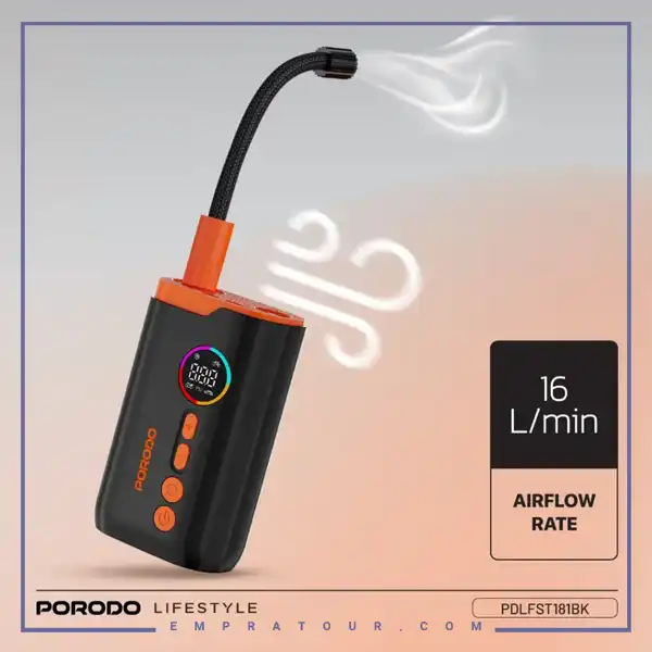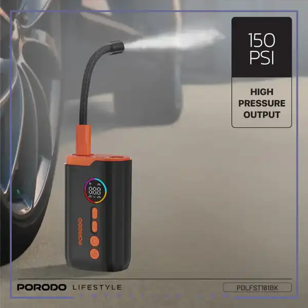 Porodo Lifestyle Electric Air Inflator With High-Pressure Power & Built-In Flashlight PDLFST181BK
