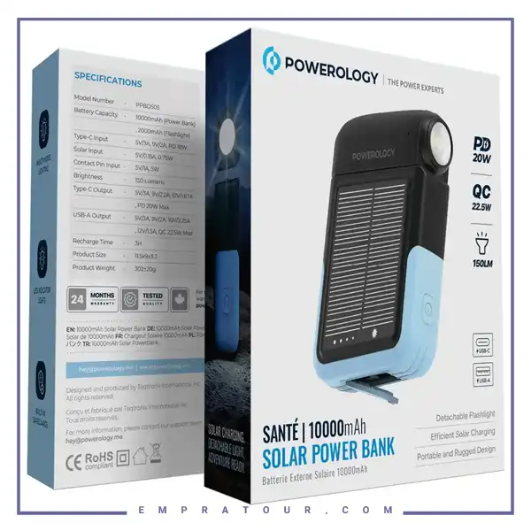 ورودی USB-C: 5V/3A، 9V/2A و PD 18W؛ ورودی خورشیدی (Solar) نیز با 5V/0.15A (≈0.75W) طراحی شده است.